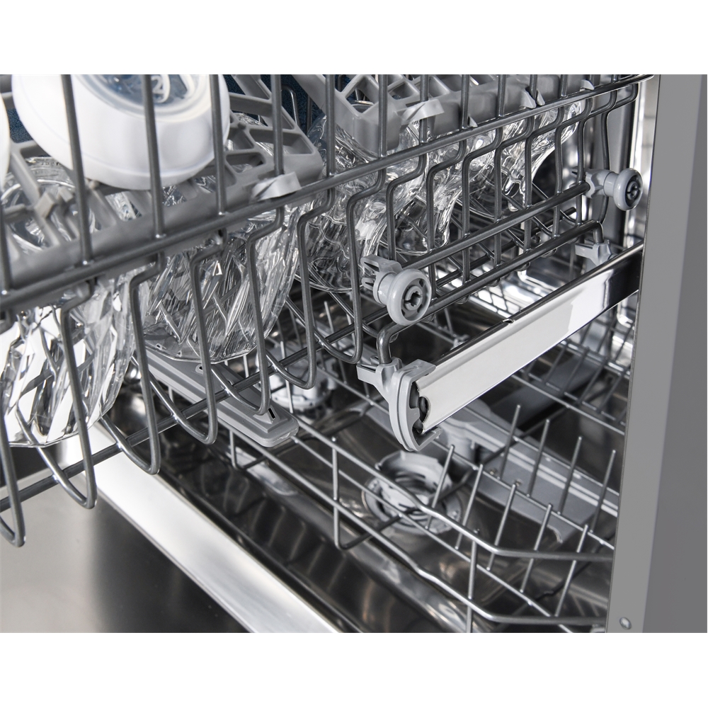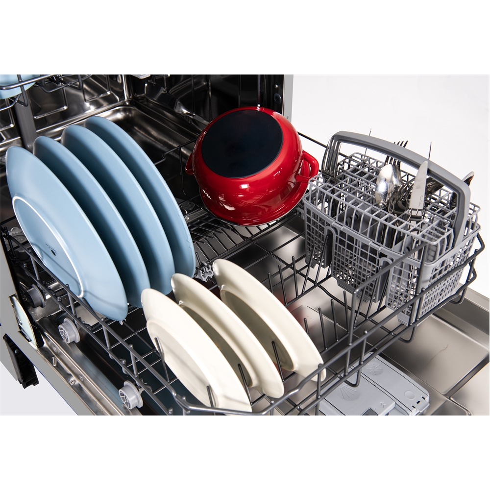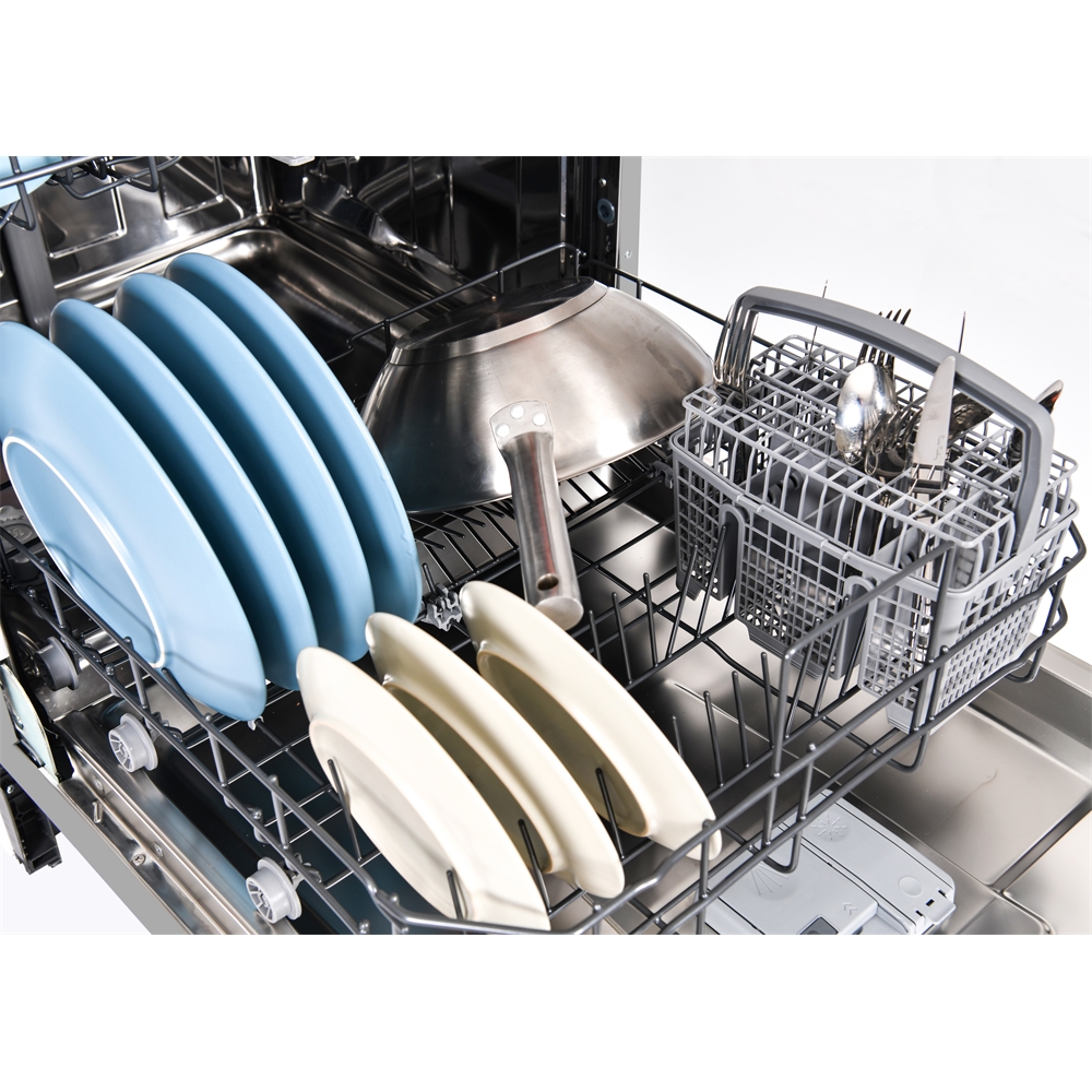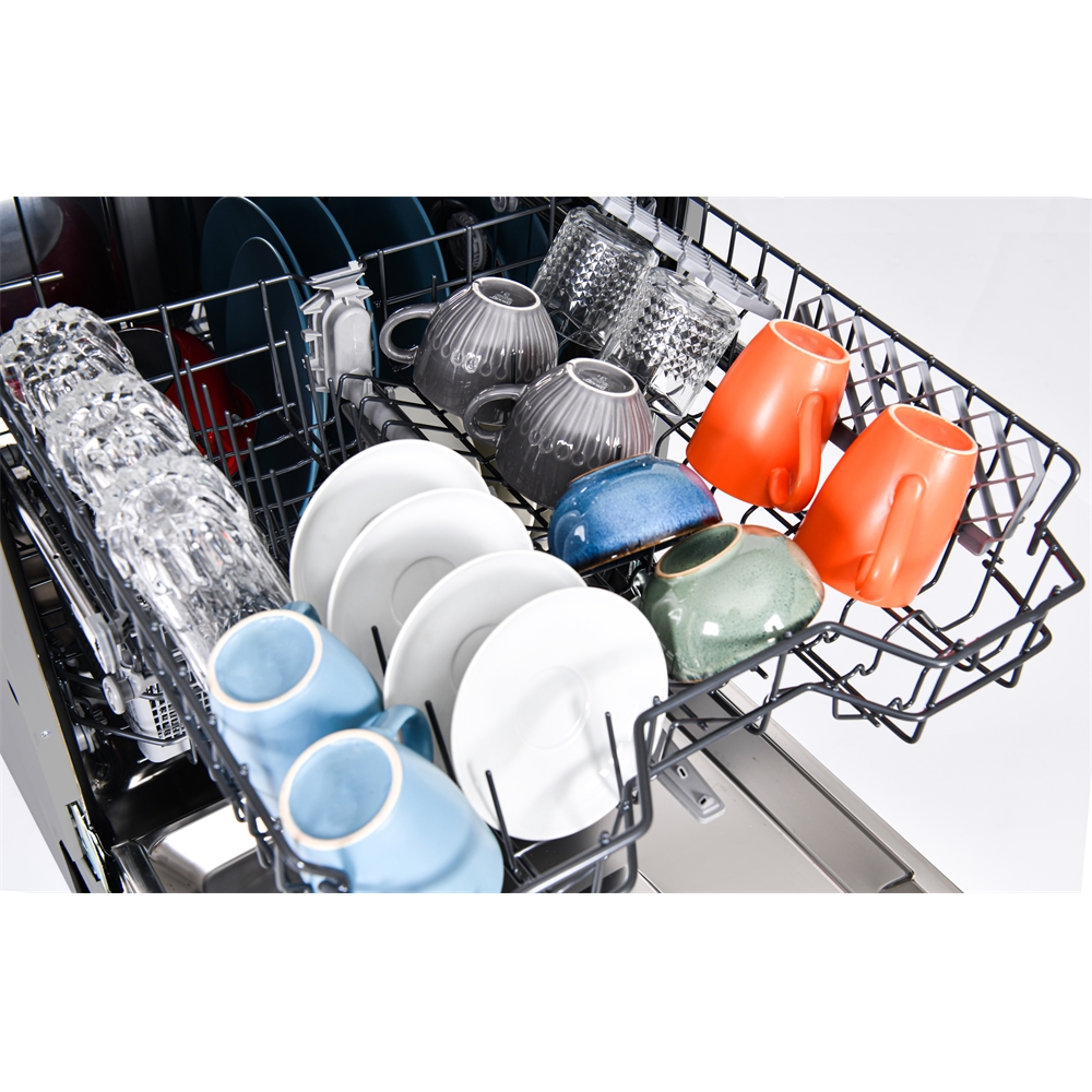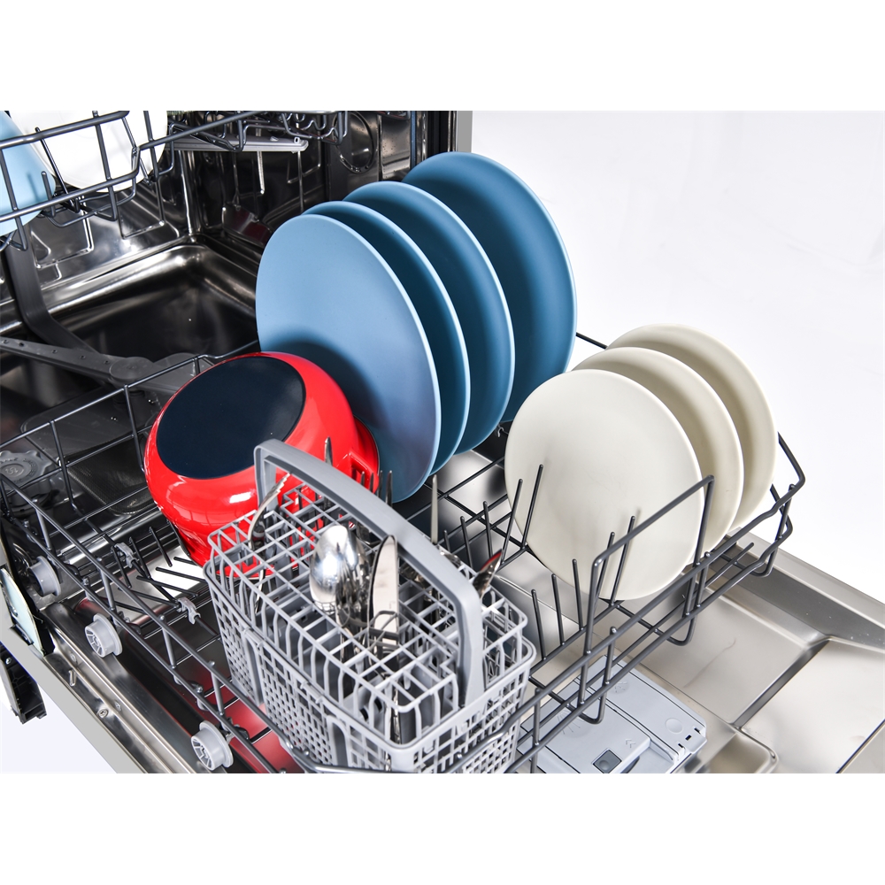 En diskmaskin som rymmer 12 kuvert och som har låg ljudnivå,45 dB, så du kan sätta igång maskinen när du vill utan att bli störd. Den har intensivdisk, snabb program, flexibla korgar med höj och sänkbar överkorg för att du ska få plats även för högre tallrikar och glas. Energiklass E